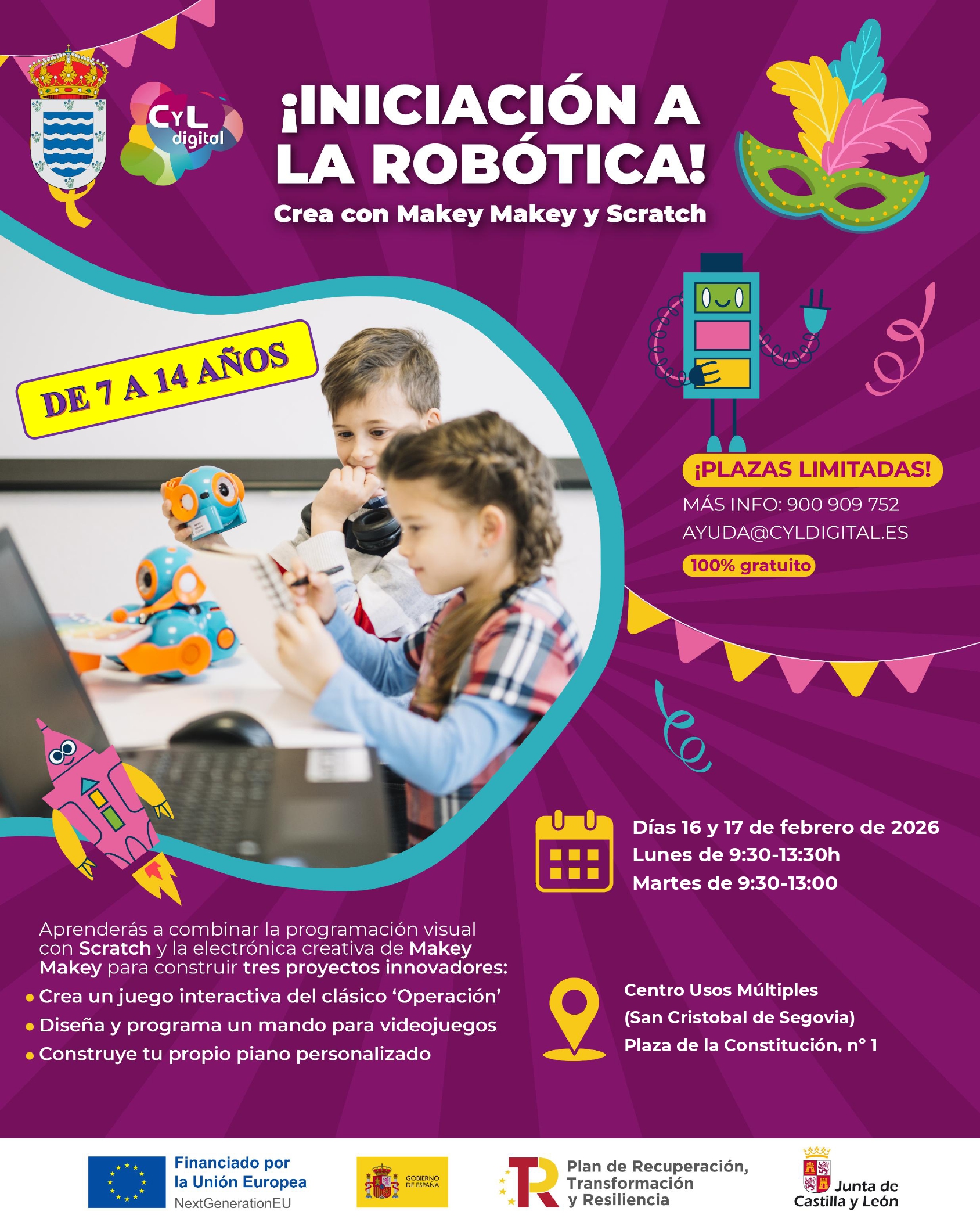 El lunes 16 y martes 17 de febrero, celebramos el Carnaval en San Cristóbal de Segovia con un taller gratuito de iniciación a la robótica para peques de 7 a 14 años. Aprenderán a crear videojuegos, pianos personalizados y hasta el clásico juego de ‘Operación’ combinando Scratch y Makey Makey.