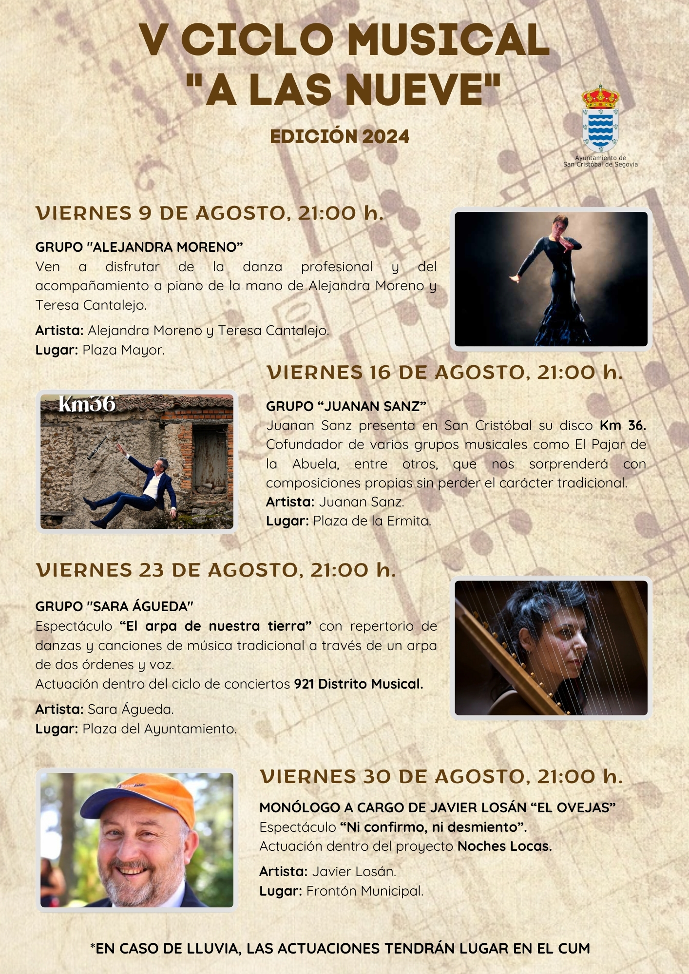 Todos los encuentros musicales son gratuitos y serán a las 9 de la noche. ¡ Que no falte nadie !
